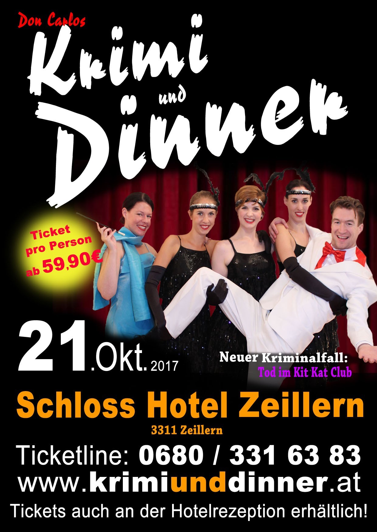 Lassen Sie sich zurück in die Goldenen 20iger entführen, in die Hochblüte des Varieté, und seien Sie VIP-Gast bei der Eröffnung des legendären ‚Kit-Kat-Clubs’, dem heißesten Club der Stadt. Durch das kulinarische mehrgängige Dinner und das Varieté-Programm führt Sie die französische Conferencière Domino PIPI. Hinter den Kulissen bleibt unter den Artisten und Mitarbeitern des ‚Kit-KatClubs’ Eifersucht nicht aus. Unverhohlen wird gemobbed, bedroht, beleidigt, gekratzt und auch vor Mord wird nicht zurückgeschreckt. Erleben Sie einen genüsslichen, kulinarischen, spannenden, wie vergnüglichen Abend mit „Don Carlos Krimi und Dinner“, und helfen Sie bei einem 3-gänge-Menü den Fall zu lösen, und den Täter zu überführen. Weitere Informationen über Termine und Spielorte von „Don Carlos Krimi und Dinner“ erhalten Sie im Internet auf www.krimiunddinner.at oder unter der Tickethotline: 0680 / 33 1 63 83.Tod im Kit Kat Club