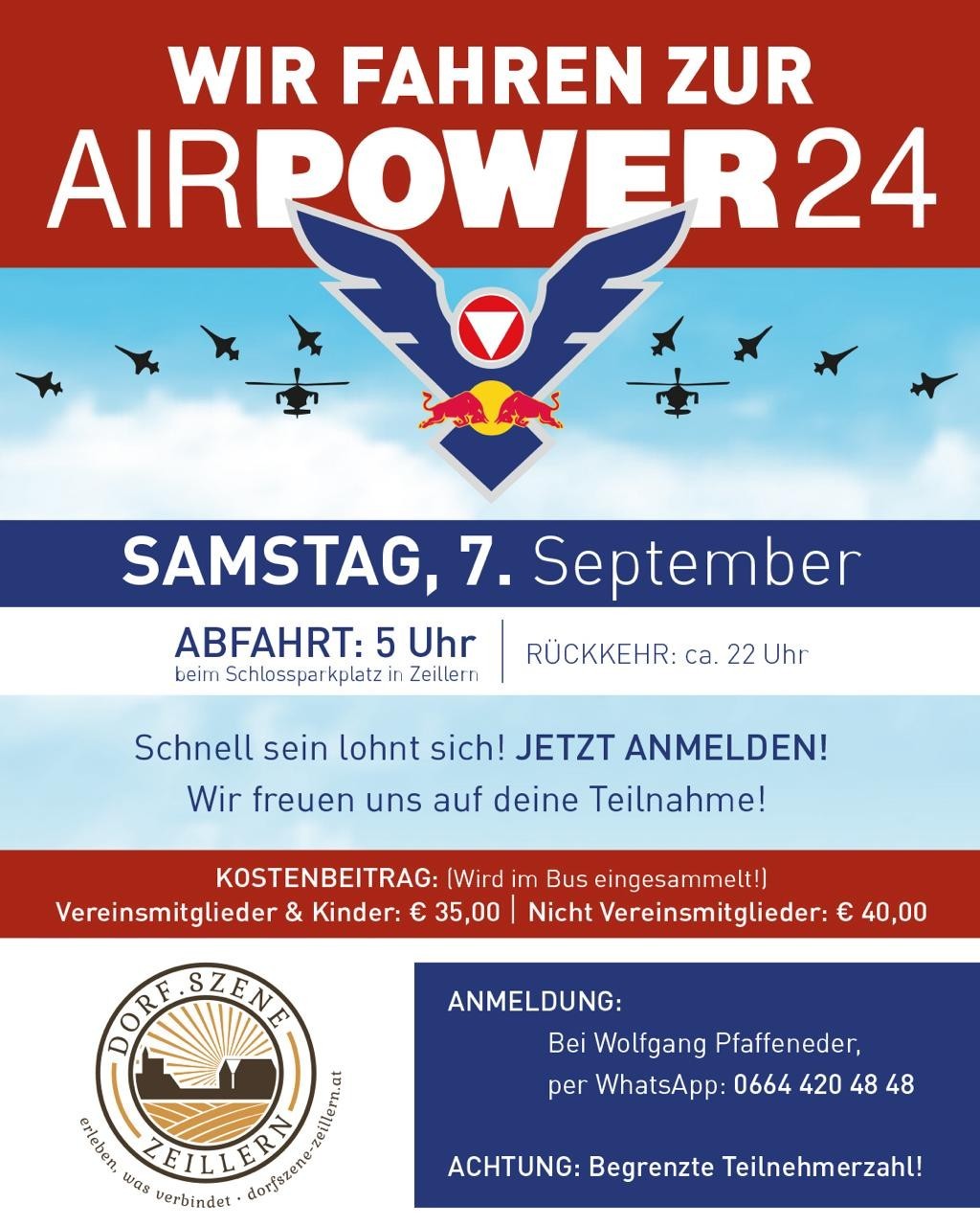 Anmeldung bei Wolfgang Pfaffeneder per WhatsApp: 0664 4204848 Schnell sein lohnt sich! Begrenzte Teilnehmerzahl!DORF.SZENE Fahrt zur AIR POWER 2024