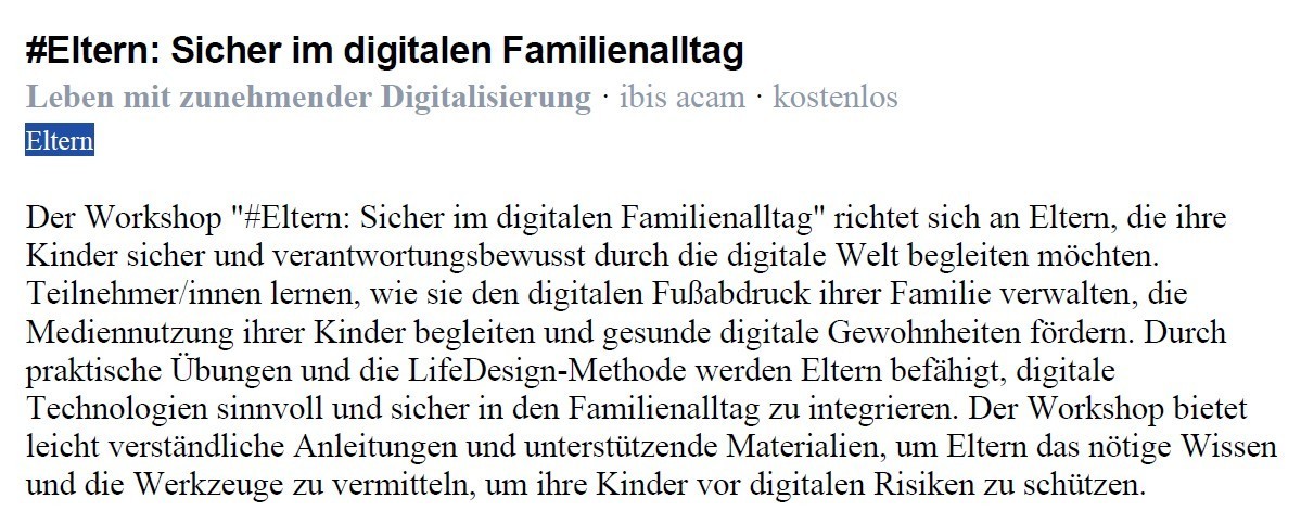 Der Workshop "#Eltern: Sicher im digitalen Familienalltag" richtet sich an Eltern, die ihre Kinder sicher und verantwortungsbewusst durch die digitale Welt begleiten möchten. Teilnehmer/innen lernen, wie sie den digitalen Fußabdruck ihrer Familie verwalten, die Mediennutzung ihrer Kinder begleiten und gesunde digitale Gewohnheiten fördern. Durch praktische Übungen und die LifeDesign-Methode werden Eltern befähigt, digitale Technologien sinnvoll und sicher in den Familienalltag zu integrieren. Der Workshop bietet leicht verständliche Anleitungen und unterstützende Materialien, um Eltern das nötige Wissen und die Werkzeuge zu vermitteln, um ihre Kinder vor digitalen Risiken zu schützen.