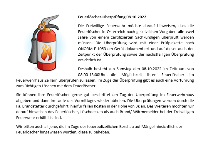 Die Freiwillige Feuerwehr Zeillern veranstaltet wieder eine Feuerlöscher Überprüfung. Es besteht auch die Möglichkeit neue Feuerlöscher zu kaufen.