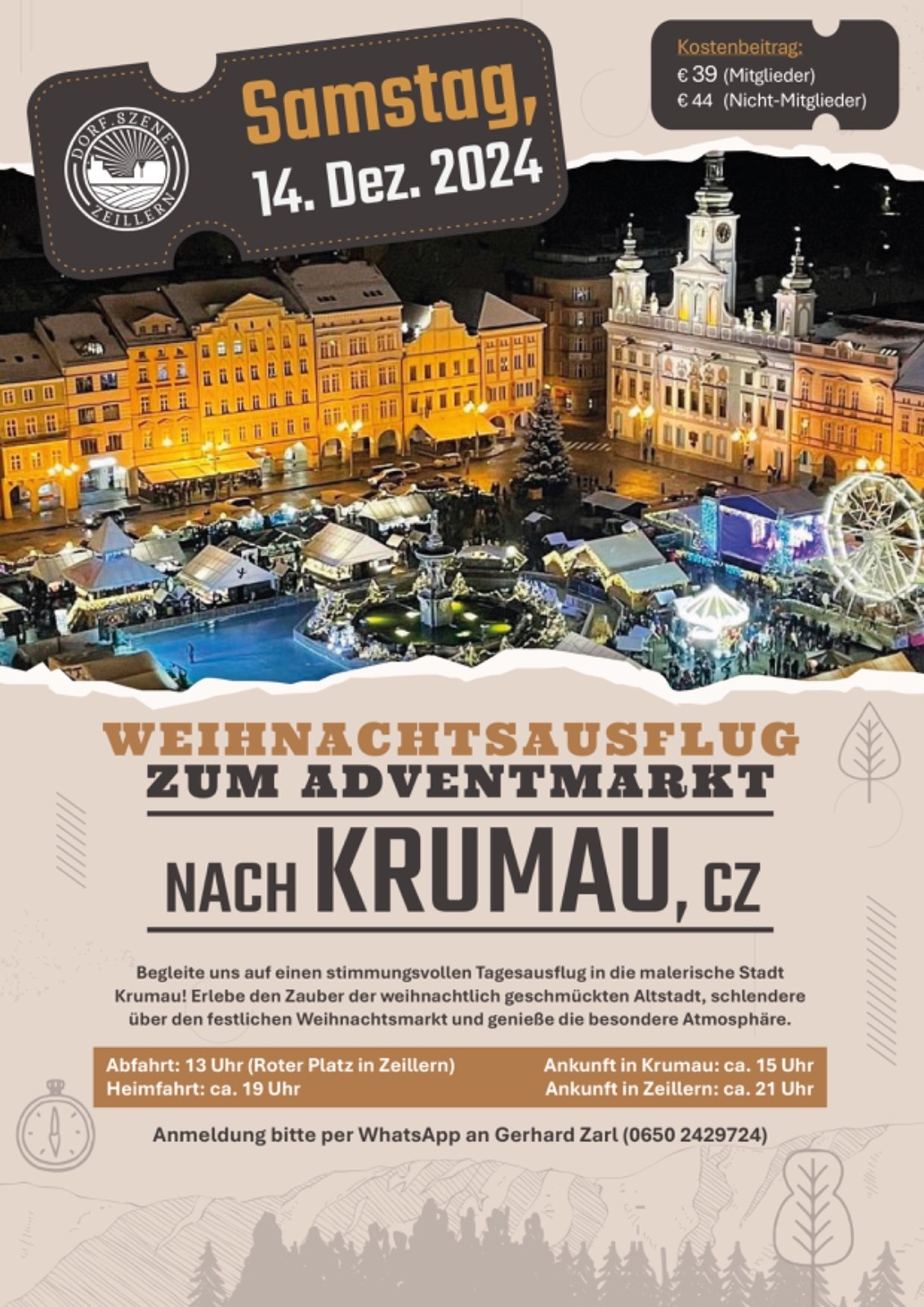 Begleite uns auf einen stimmungsvollen Tagesausflug in die malerische Stadt Krumau! Erlebe den Zauber der weihnachtlich geschmückten Altstadt, schlendere über den festlichen Weihnachtsmarkt und genieße die besondere Atmosphäre. Abfahrt in Zeillern: 13 Uhr (Roter Platz) Ankunft in Krumau: ca. 15 Uhr Heimfahrt: ca. 19 Uhr Ankunft in Zeillern: ca. 21 Uhr Anmeldung bitte per WhatsApp an Gerhard Zarl: 0650 24 29 724Unterwegs mit der DORF.SZENE Zeillern