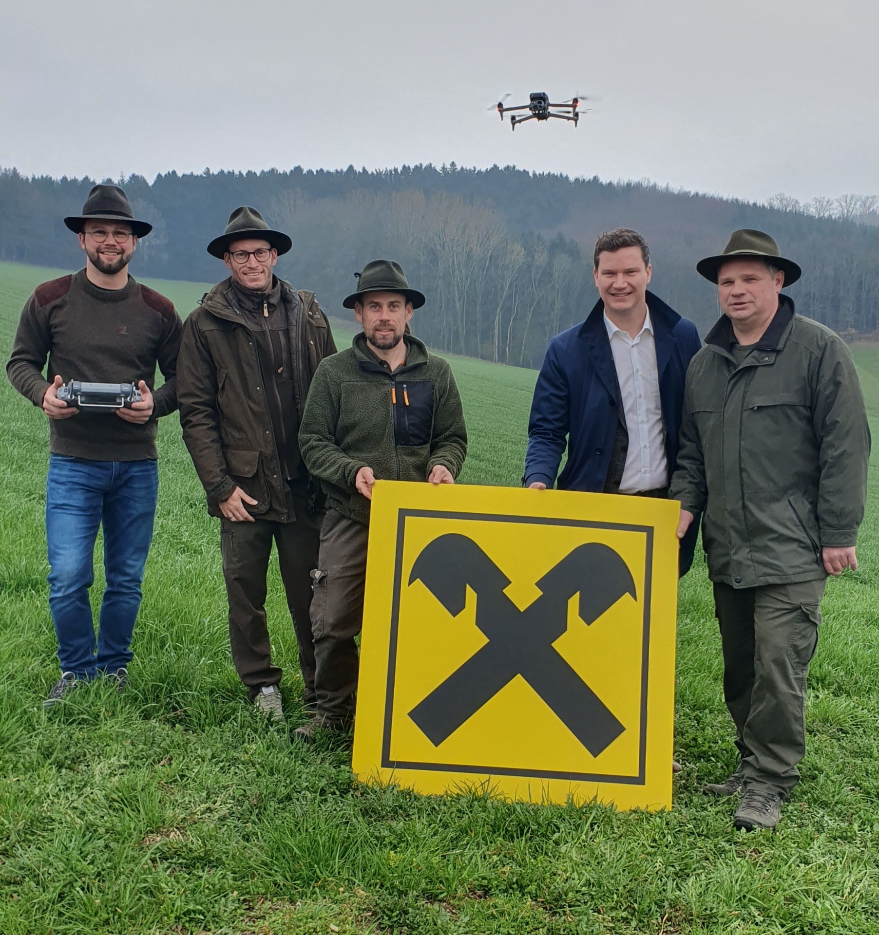 Am Bild von links: Die Drohnenpiloten Anton Haimberger, Manuel Bachleitner, Robert Heindl, Prokurist der Raiffeisenbank Region Amstetten Florian Wurz MSc., Jagdleiter Adolf Gruber