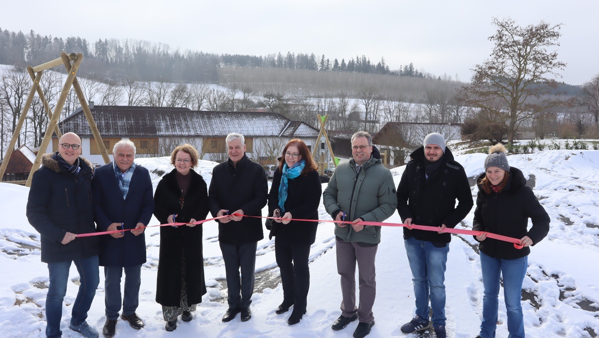 Anschließend besuchten die Gäste auch noch den neuerrichteten Spielplatz mit der neuen Pumptrack-Anlage und konnten bei winterlichen Bedingungen auch hier mit einer Banddurchtrennung den Spielplatz offiziell eröffnen.