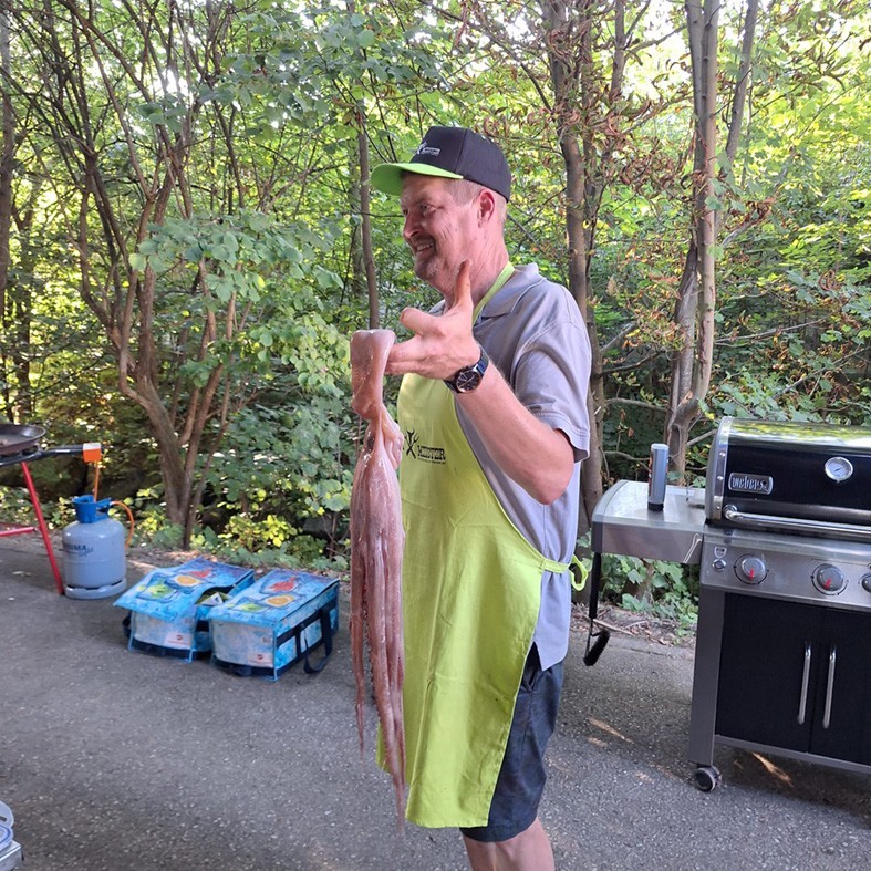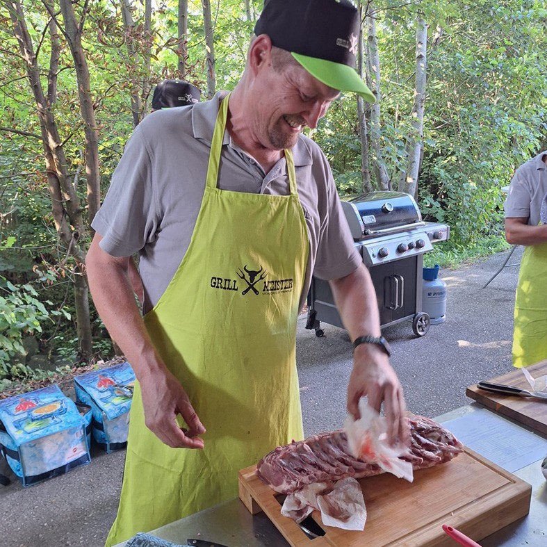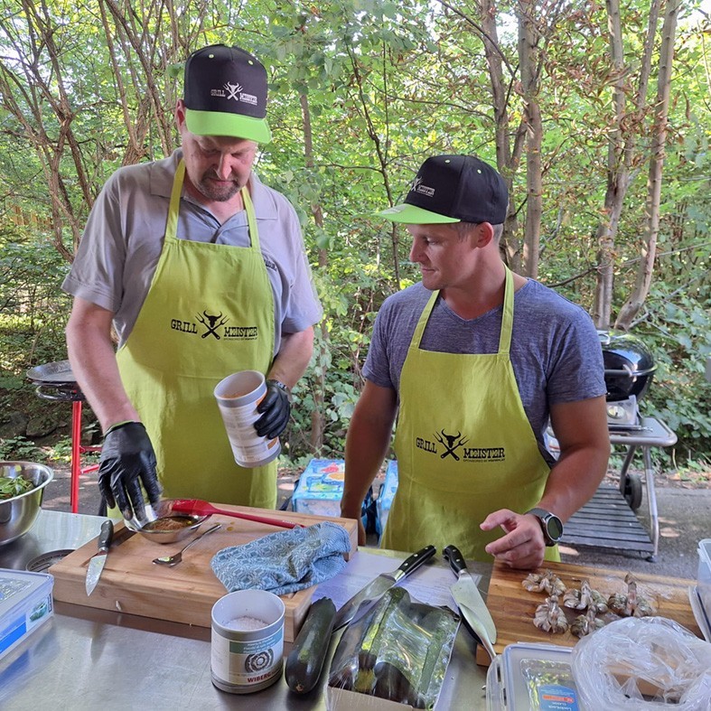 Gemeinsam mit den Grillmeistern Thomas und Anton haben wir ein abwechslungsreiches Menü zubereitet: Wurstbrettbrötchen auch in einer vegetarischen Variante, Oktopus, Schweine- und Rindfleisch, Hähnchenteile, Forellen, ein Porterhouse-Steak sowie verschiedene Beilagen. Zum Abschluss gab es einen Schokokuchen vom Grill.