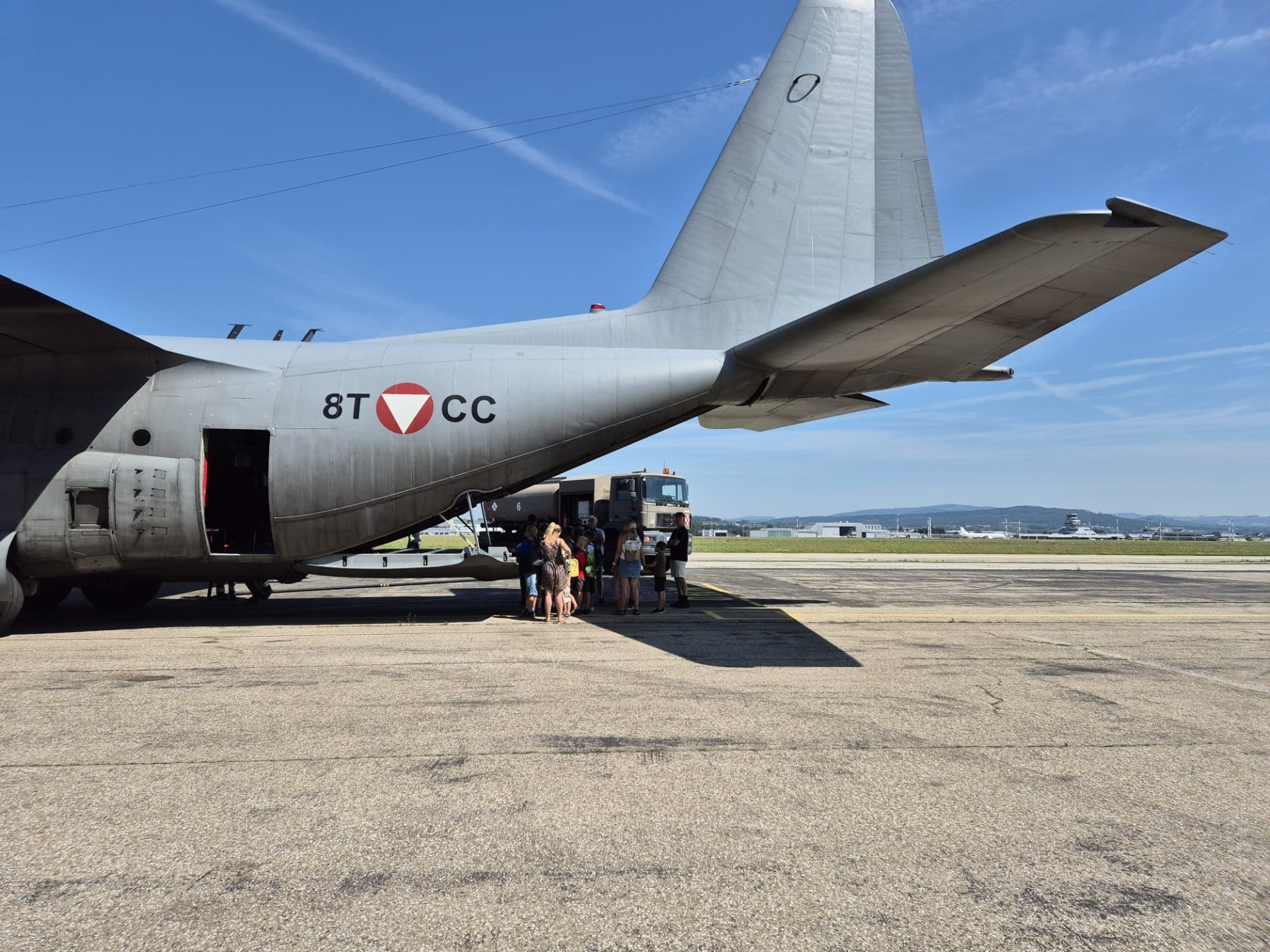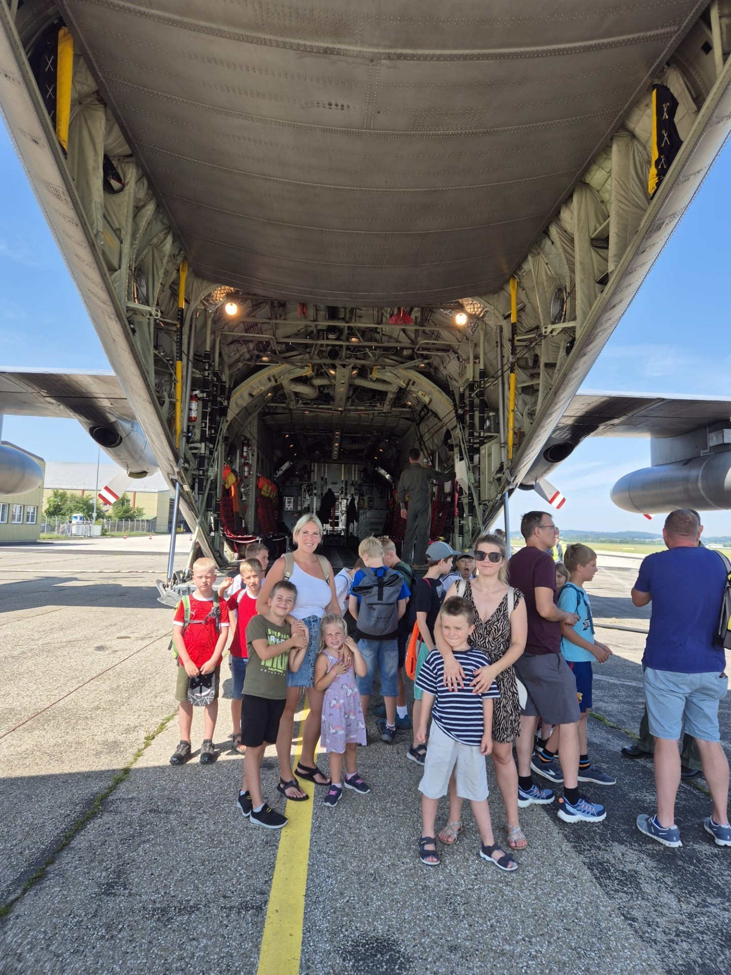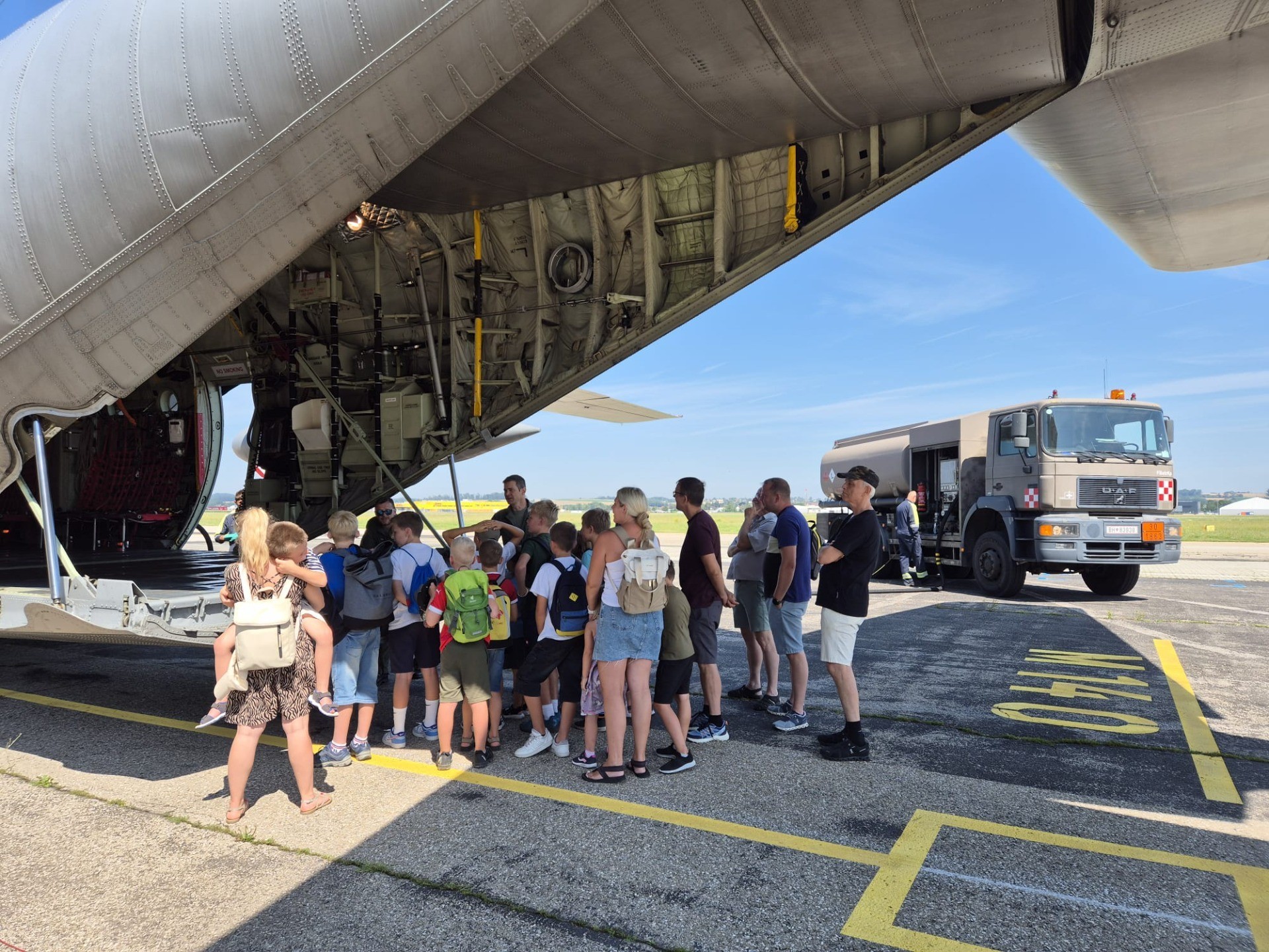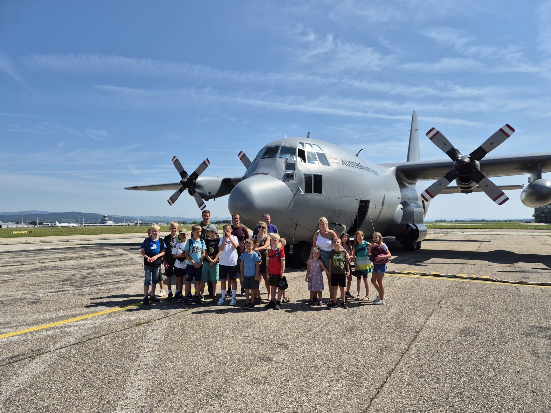 Am 15.07.2024 verbrachten 16 Kinder mit Ihren Begleitpersonen einen sonnigen und heißen Tag beim Ausflug im Rahmen der Kinderferienspiele in der Kaserne Hörsching - Fliegerhorst Vogler. Die Kinder hatten die Möglichkeit, die Hercules, Bundesheerhubschrauber, die Bundesheerfeuerwehr und noch vieles mehr kennenzulernen und spannende Einblicke in die Arbeit des Bundesheeres zu erhalten. Nach einem ereignisreichen Vormittag genossen sie noch ein gemeinsames leckeres Mittagessen.