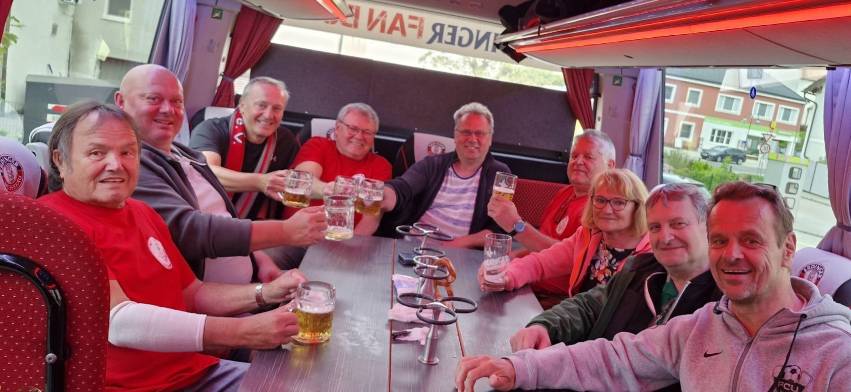 Foto - Sitzecke im Bus zeigt von links nach rechts : Fanclubpräsident Franz Sammer, Manfred Knapp, Altbürgermeister Zeillern Jimmy Perger, Altbürgermeister Zeilarn Werner Lechl, Bürgermeister Zeillern Fritz Pallinger, Fanclubvizepräsident Sepp Werkstetter, Patenbraut Rosemarie Kiemayer, Adalbert Kammerhofer und Walter Enengl Zeillern.